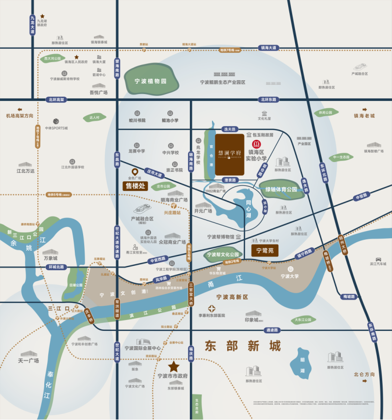 慧澜学府项目位于宁波市镇海区庄市核“芯”的同心湖板块,与宁波东部新城隔江相望,系宁波市中心城区组成部分。